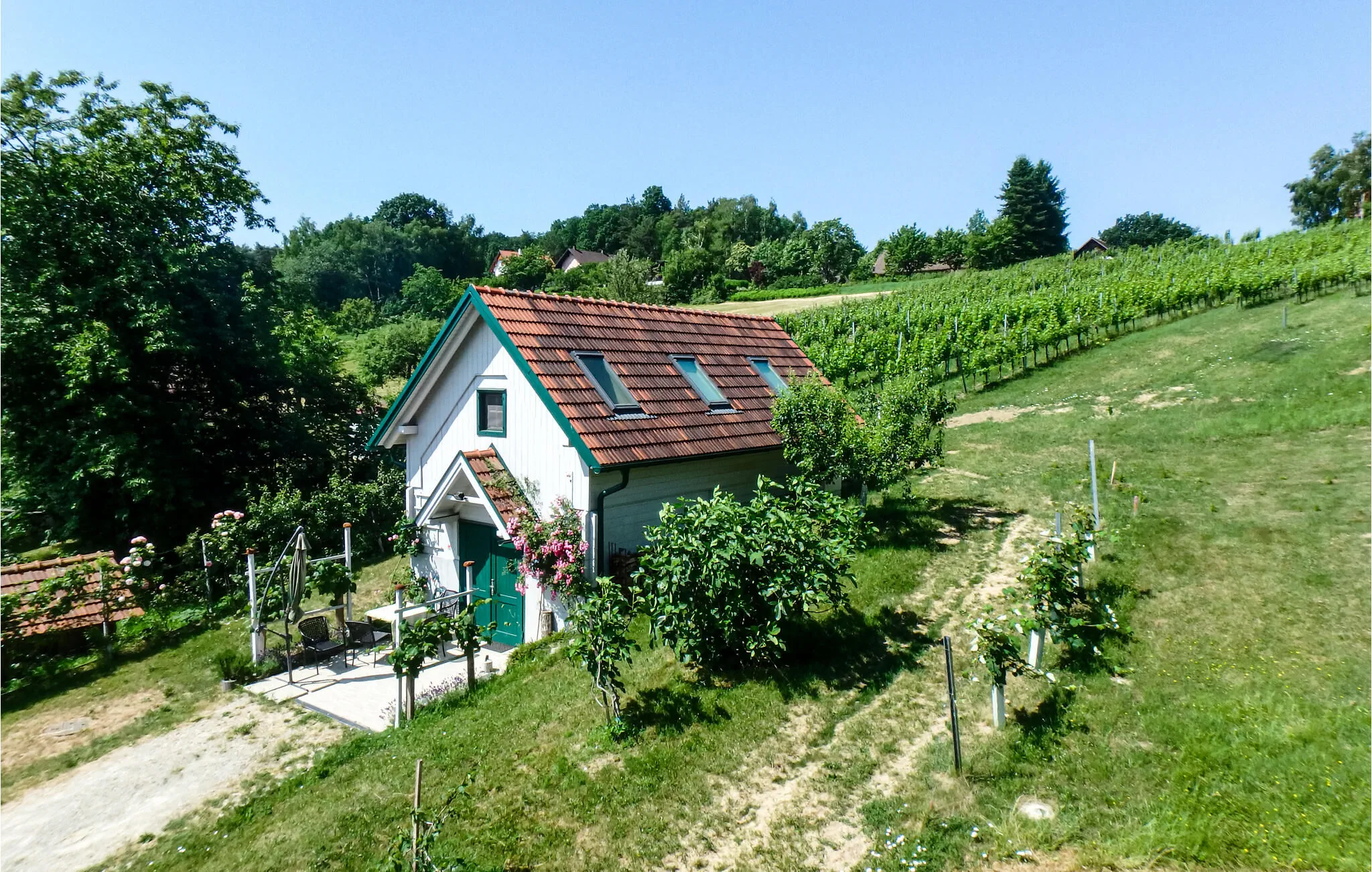 Haus von Holz und Tegel, Winterfest, Naturgebiet, Gartenmöbel